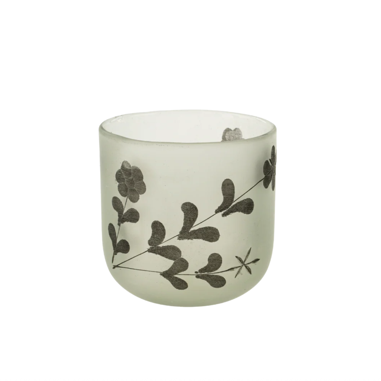 A simple pattern of floral sprigs softens the minimalism of black and white in these vases. Hand-blown in India and featuring a frosted finish, these small vessels make a statement without being overwhelming. Filled with flowers, used as a candle votive, or just displayed in their own right, these jars are sure to add style to any space.