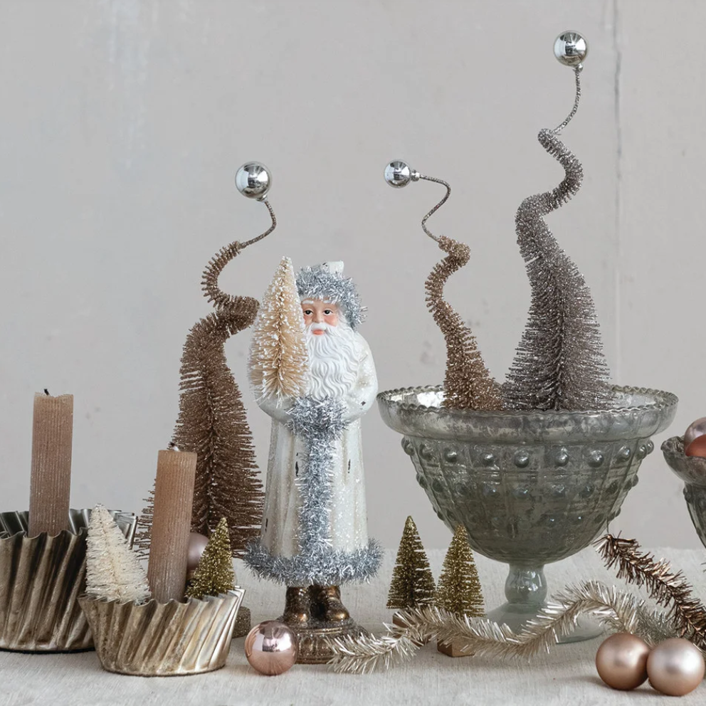 Santa with Bottle-Brush Tree - White