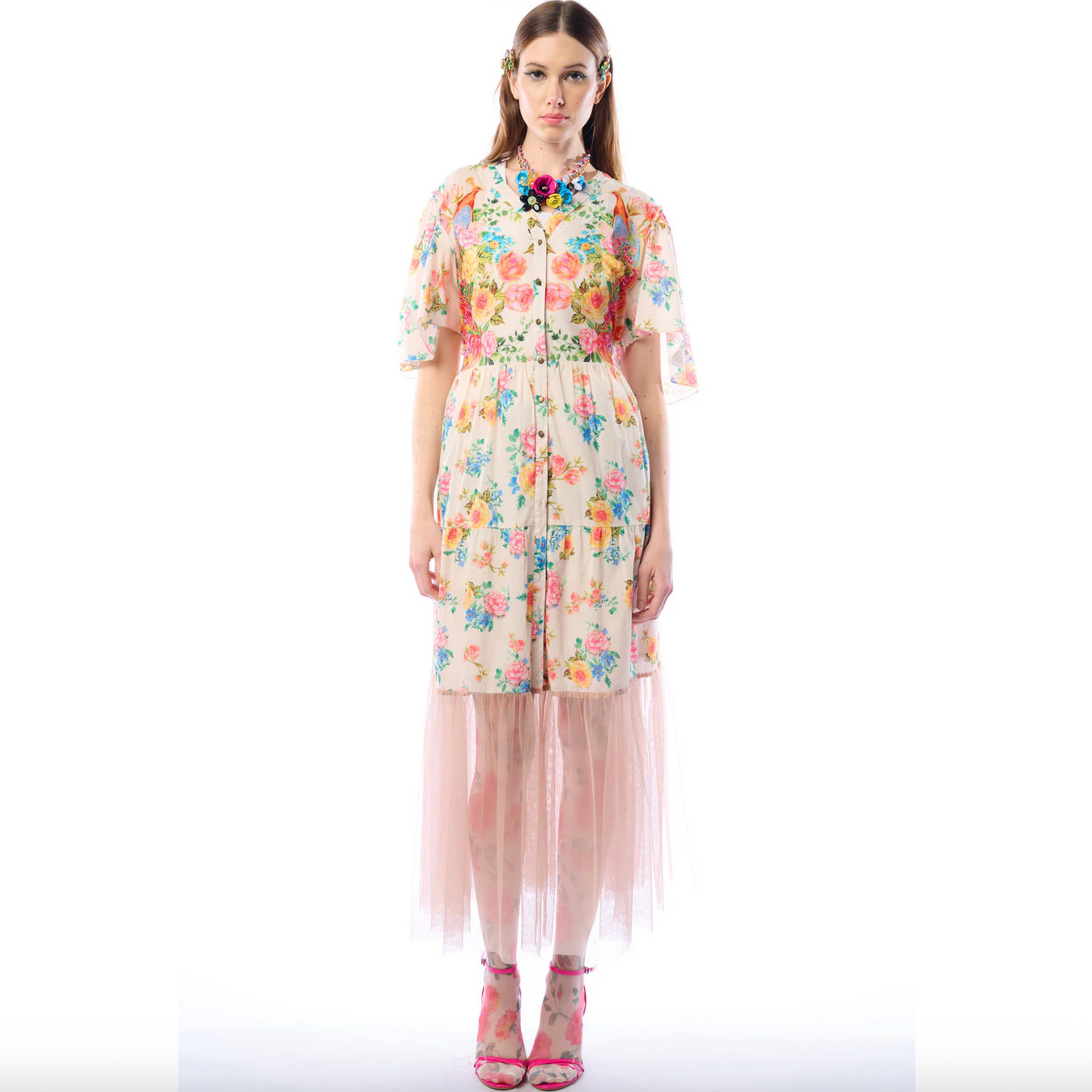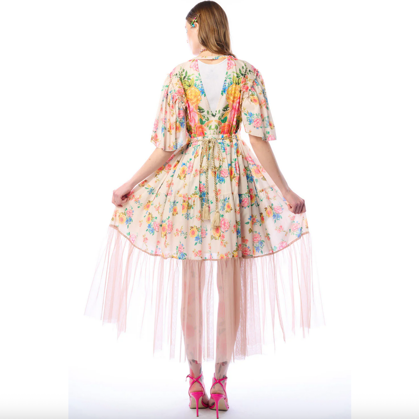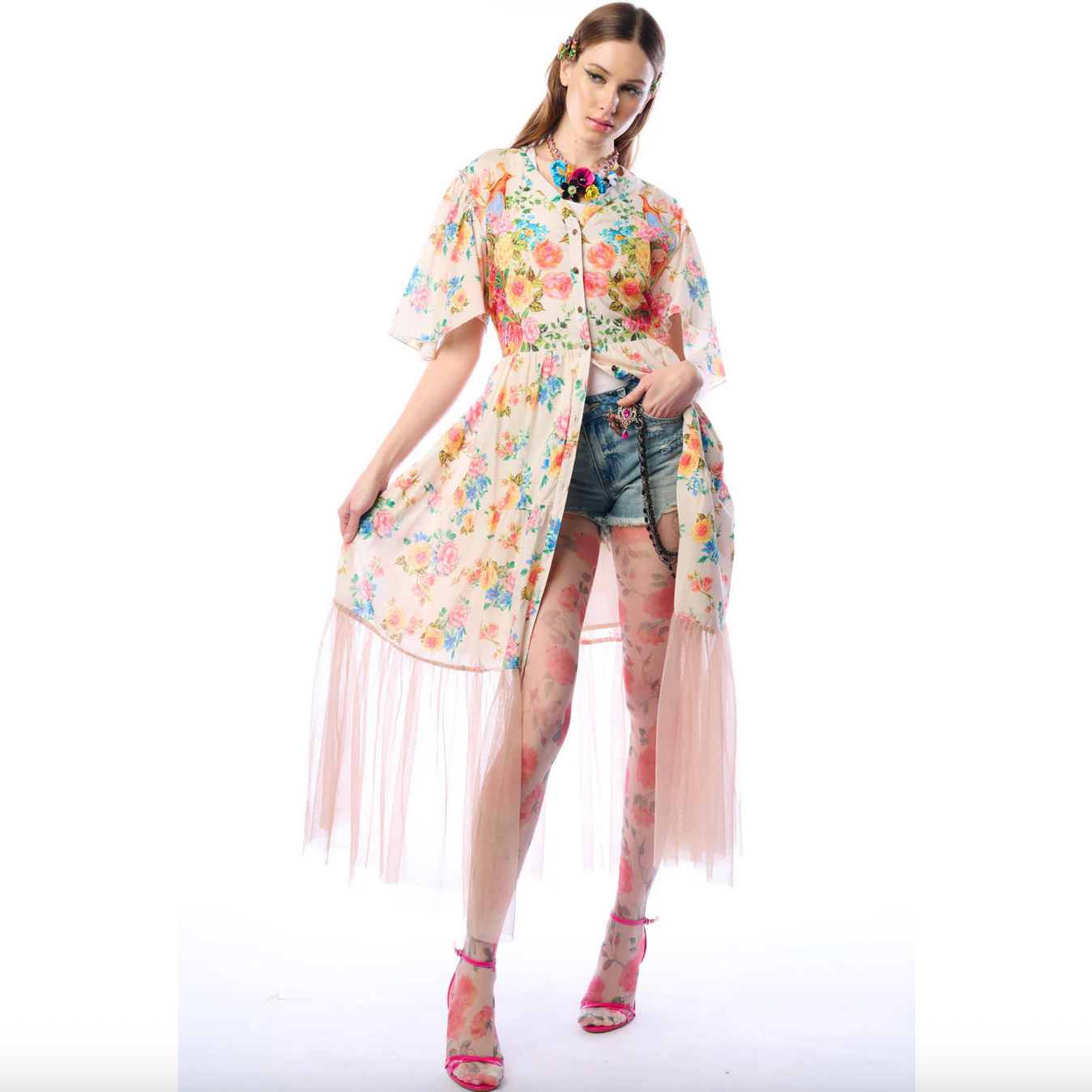 Float through your day with an angelic aura in this mixed-media dress. Soft cotton is printed with a colorful print of flowers and peacocks, and a wide lower ruffle of sheer tulle lends an ethereal elegance to this one-of-a-kind piece. Asymmetrical elbow-length sleeves, a V neckline, and button-front construction makes it a versatile option for styling as a dress or a duster. An open back cut-out and waist tie finish off the look with pretty polish (oh, and it has pockets!). Wear it as a pool cover-up, for a wedding or baby shower, or just because you deserve it.